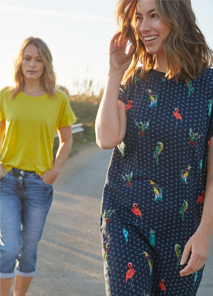 Key-Pieces der April-Kollektion sind Blusen und Shirts mit einem Stylemix aus Streifen, floralen Prints und funny Symbols. Softe Materialien, wie zum Beispiel Lyocell, die sich bequem im Alltag tragen lassen, runden das Rund-um-Wohlfühl-Gefühl ab und machen Lust auf Spaziergänge in der Natur und gemütliche City-Bummel.