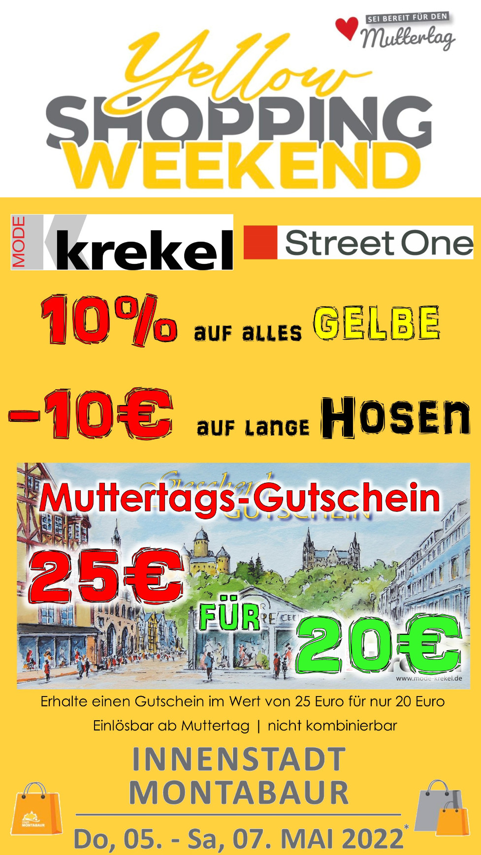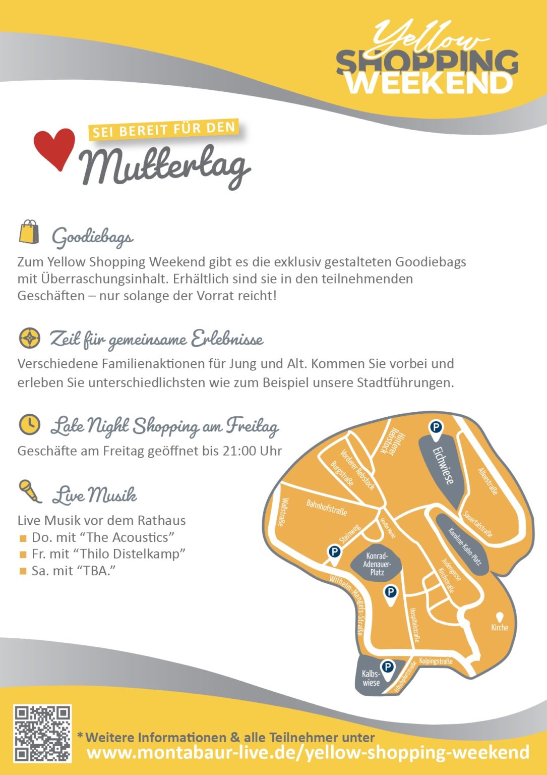 Hallo ihr Lieben, ab heute beginnt in Montabaur das „Yellow Shopping Weekend“, mit tollen Angeboten und Live Musik in der Stadt! Am Freitag sind unsere Geschäfte bis 21:00 Uhr geöffnet.